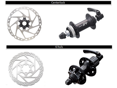 • 6-hulsmonteringssystemet er ældre og mere traditionelt. Det indebærer brug af en skive med seks huller jævnt fordelt rundt omkring navet. Disse huller matcher monteringspunkterne på selve navet. Skiven fastgøres ved at indsætte skruer gennem hullerne og ind i navet. Dette system kræver normalt brug af et momentnøgle for at sikre, at skruerne er strammet korrekt. En fordel ved 6-hulsmontering er, at det er meget stabilt og sikrer, at skiven forbliver sikkert fastgjort under hård bremsning.