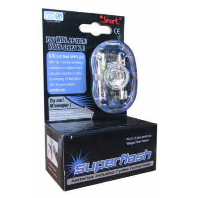 Med Smart Superflash forlygte får du en kompakt og vandtæt lygte, der sikrer synlighed og sikkerhed på dine cykelture. Den medfølgende lygteholder gør det nemt at montere lygten på styret, og de medfølgende 2 x AAA batterier sikrer, at du er klar til at køre med det samme.